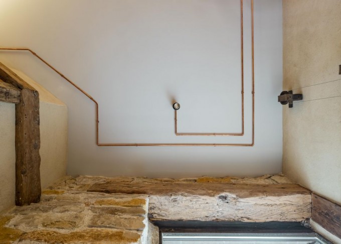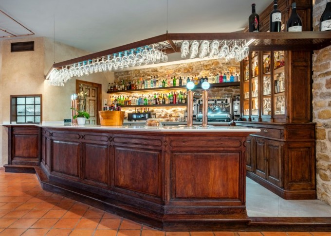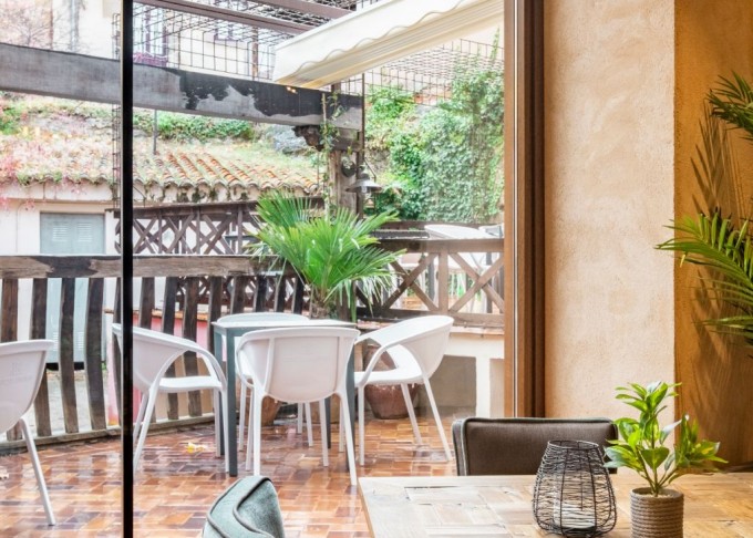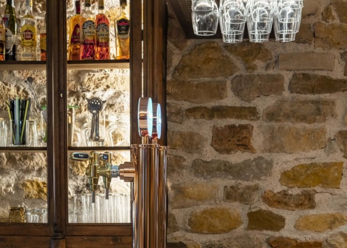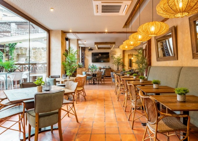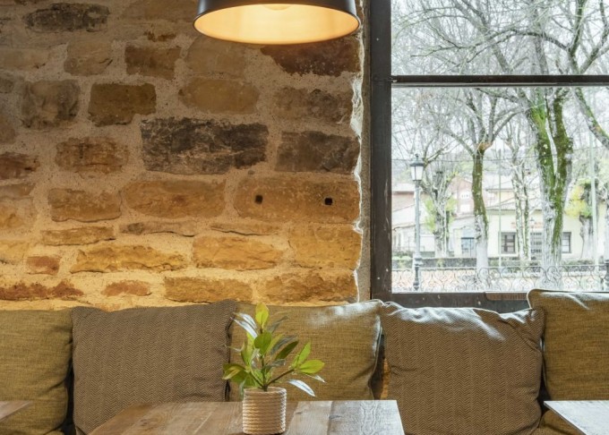 Therefore, the restaurant now makes use of wooden upright supports and beams, local stone cladding, textured plaster, terracotta floors, all while reusing elements from the past, such as the elaborate wooden bar with its hexagonal geometry that was once a counter in Hotel Elías, the setting for the film "El viaje a ninguna parte" (Voyage to Nowhere) (Fernando Fernán Gómez, 1986). Old iron beams with rounded edges are also reused to make pieces of bespoke pieces of furniture.