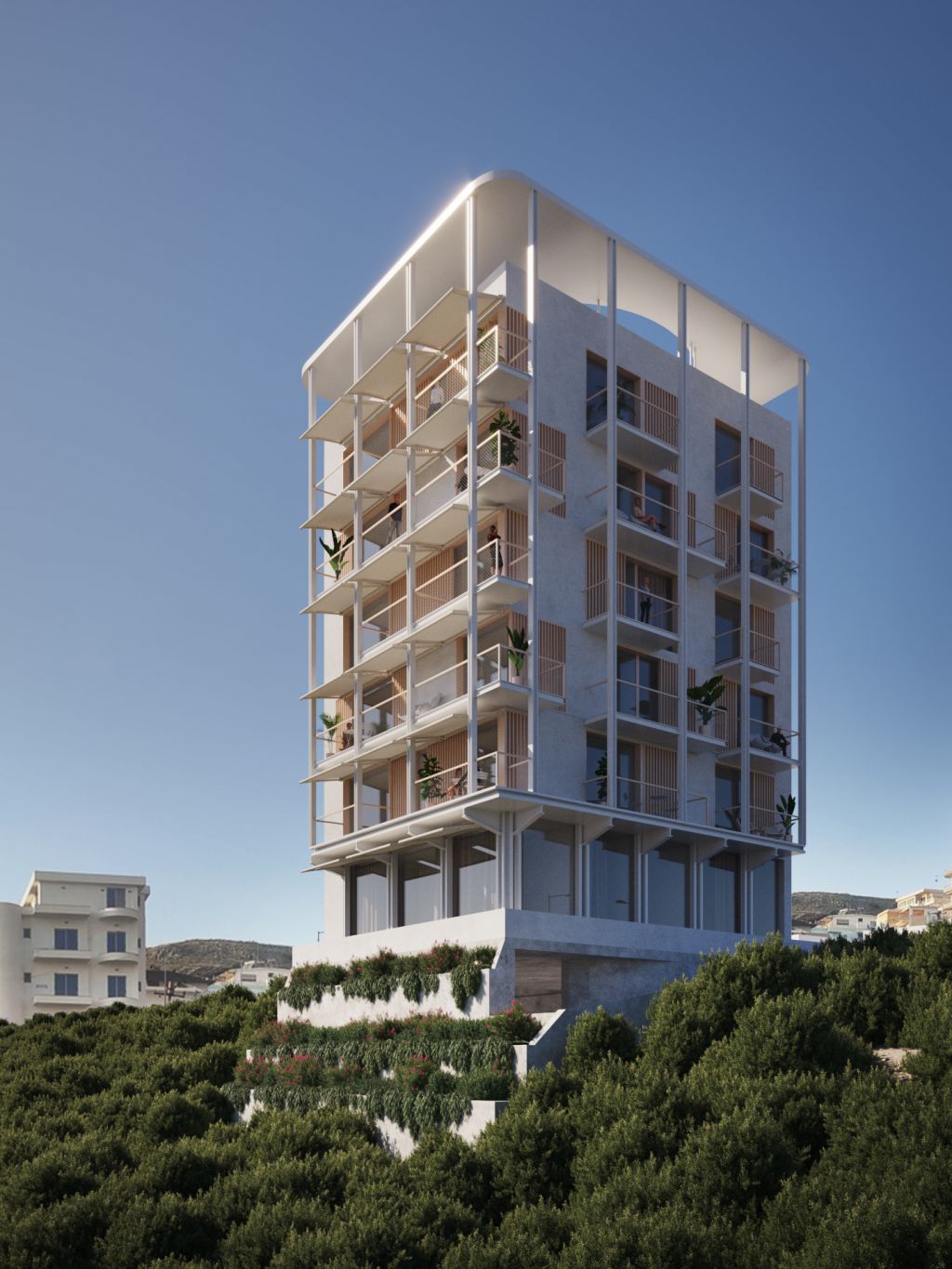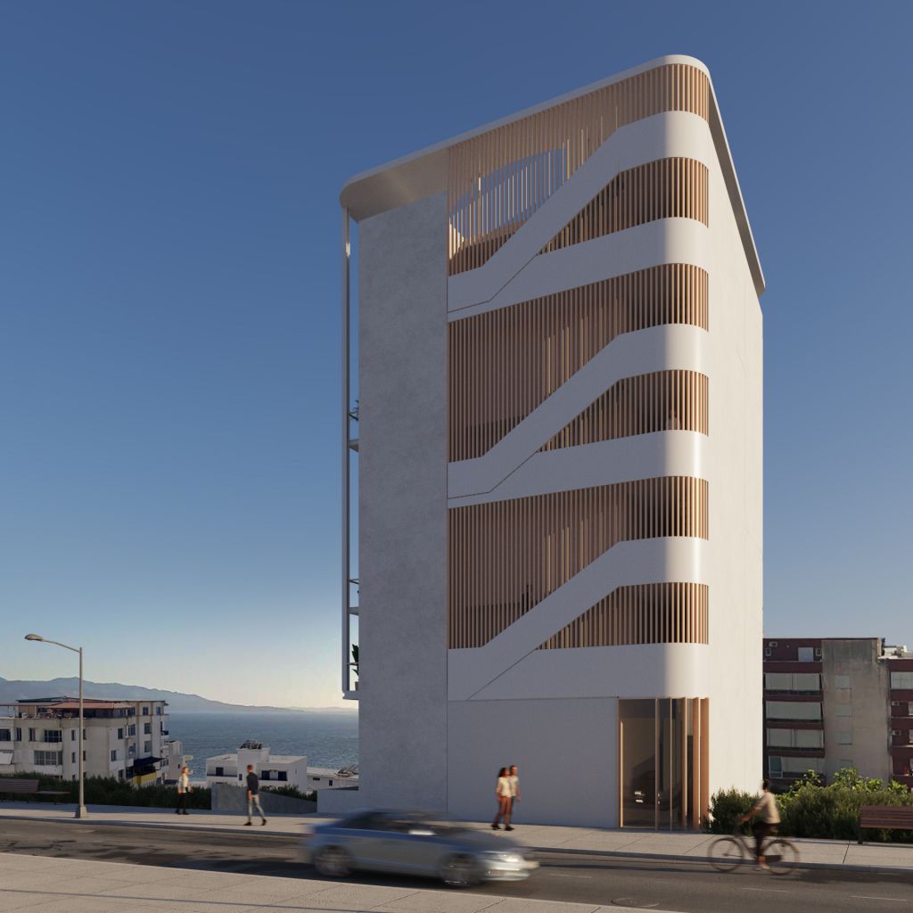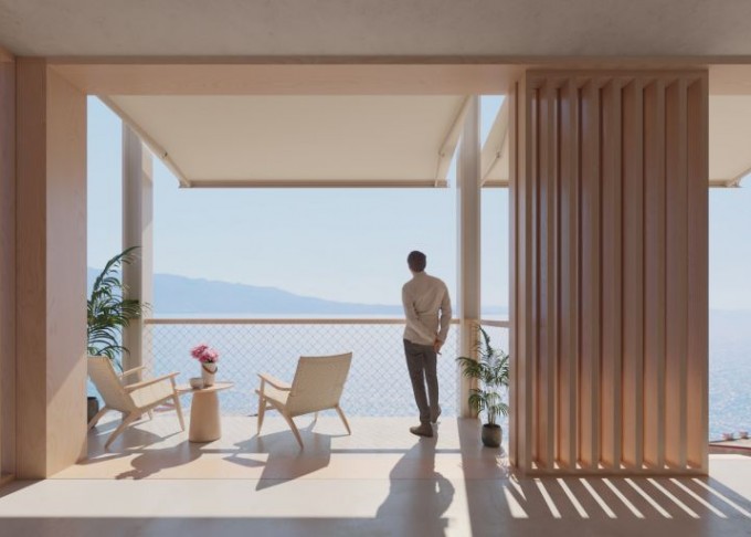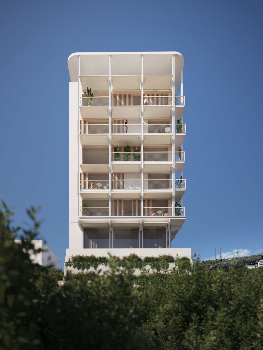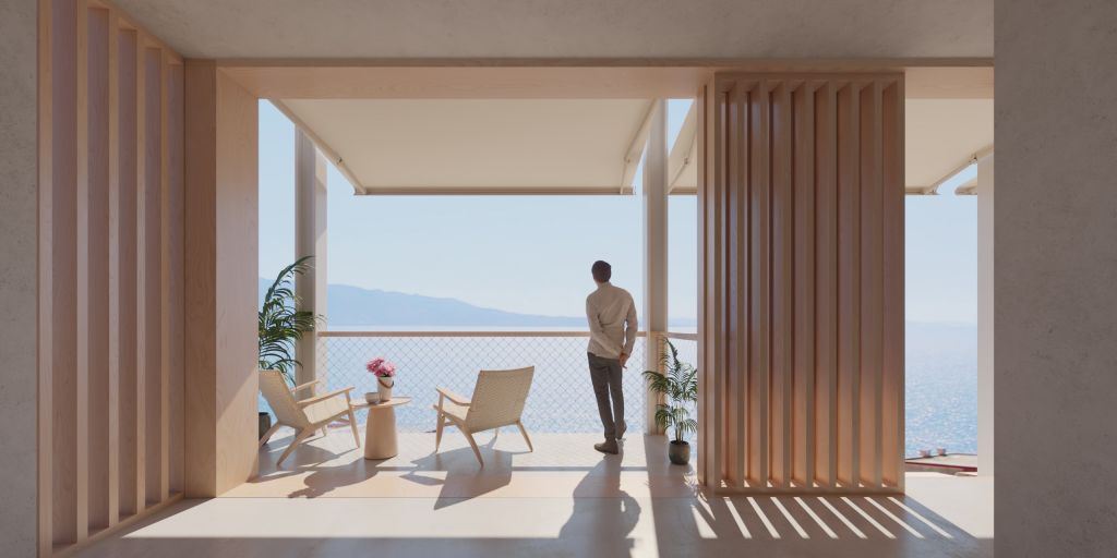 El formigó blanc vist esdevé el principal material estructural i expressiu, complementat amb elements de fusta emblanquinada i metall en tonalitats clares —blanc i gris topo—. Aquesta paleta neutra dialoga amb la llum canviant de l’entorn costaner, intensificant la sensació de lleugeresa i reforçant el caràcter eteri del conjunt.