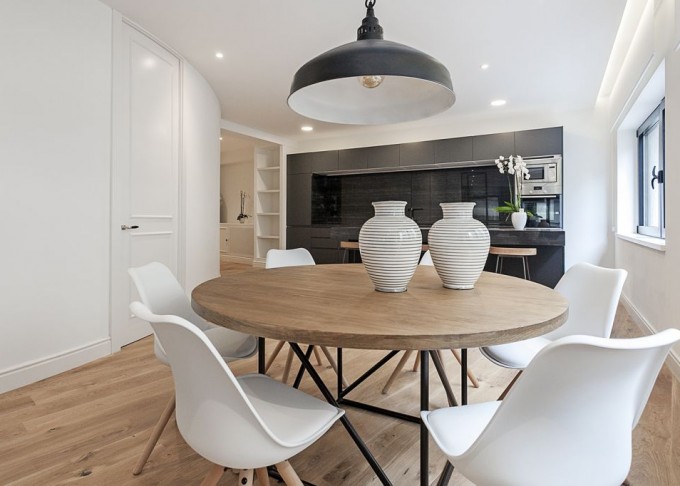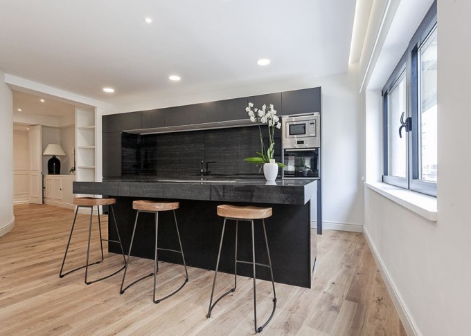 La cuina té com a element principal una enorme illa amb taulells de porcelànic simulant marbre negre, compartint protagonisme amb els grans finestrals que donen al concorregut carrer de Balmes, l'aïllament tèrmic i acústic dels seus vidres han estat millorats.