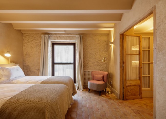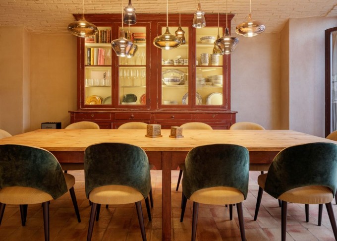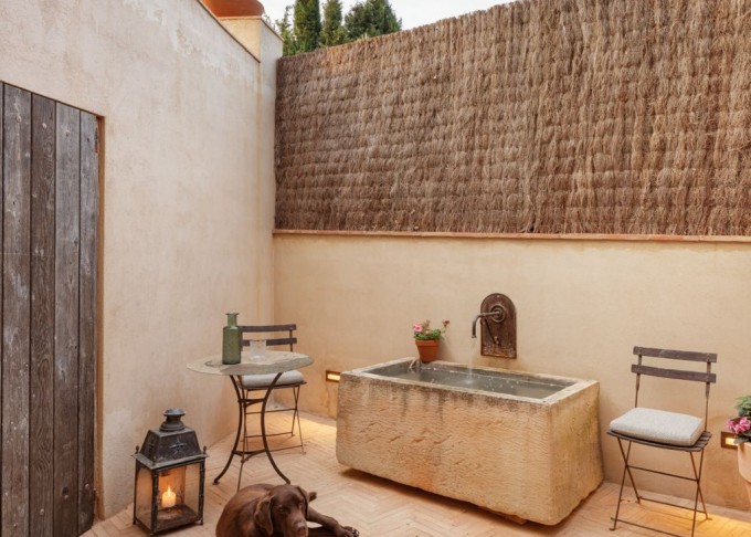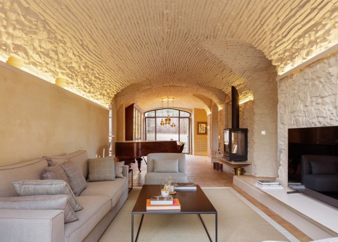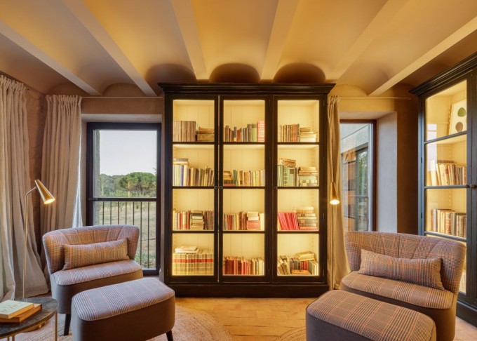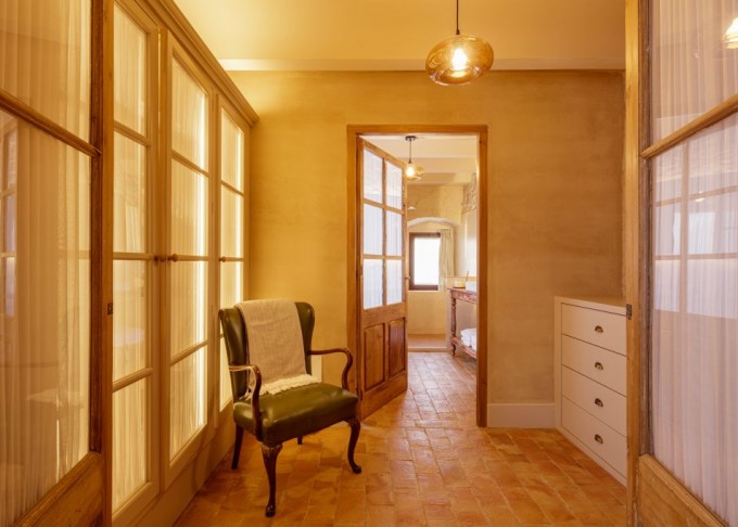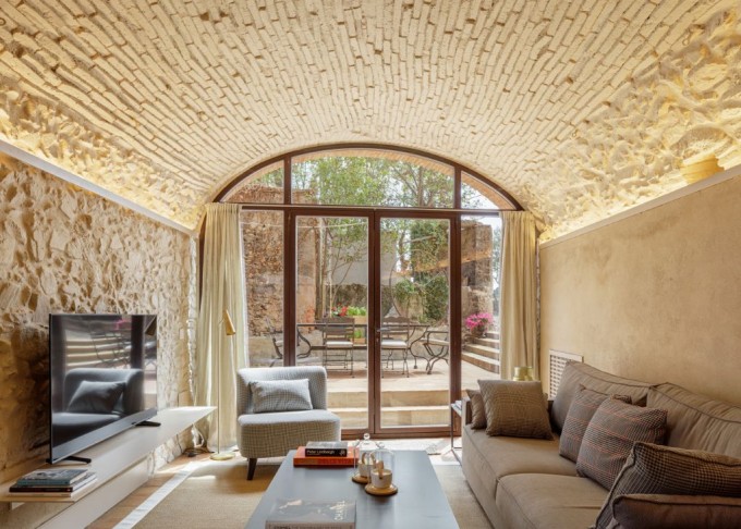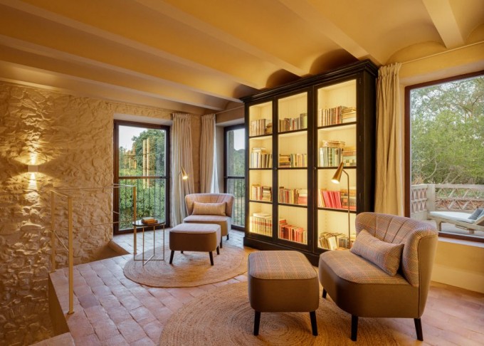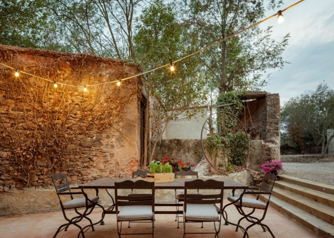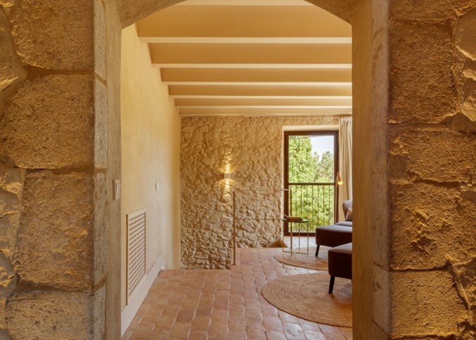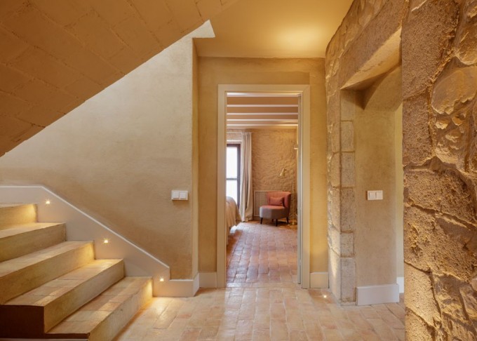 Elements provinents de recuperació, com són brancals i llindes de pedra, rajoles de ceràmica manual, portes, rentamans, aigüeres, tanques, fanalets, fonts i mobles apareixen en la intervenció reforçant la identitat de la masia, en un marc de colors ocres amb textures i materials rugosos.