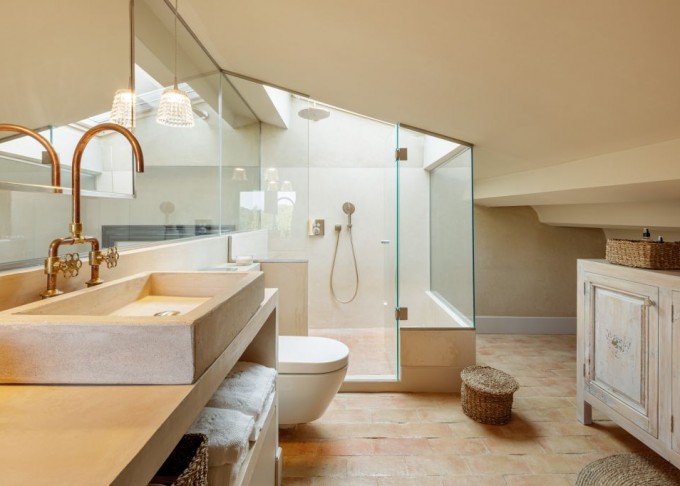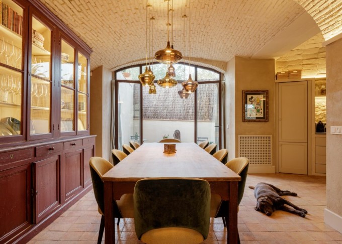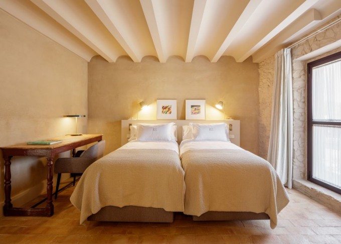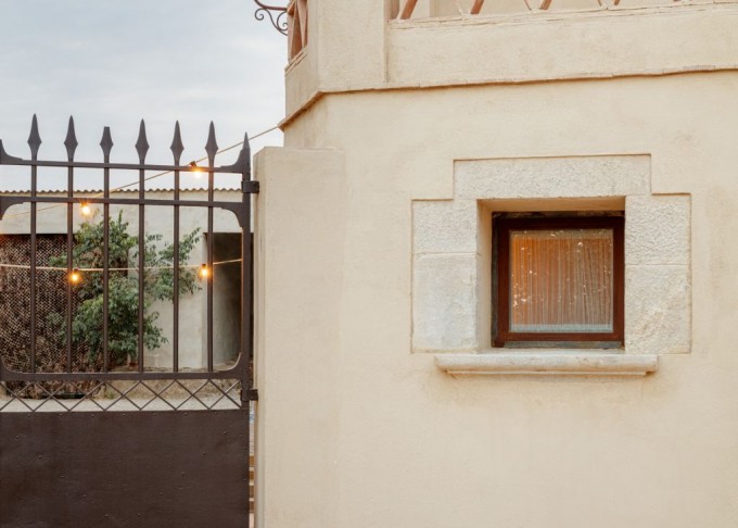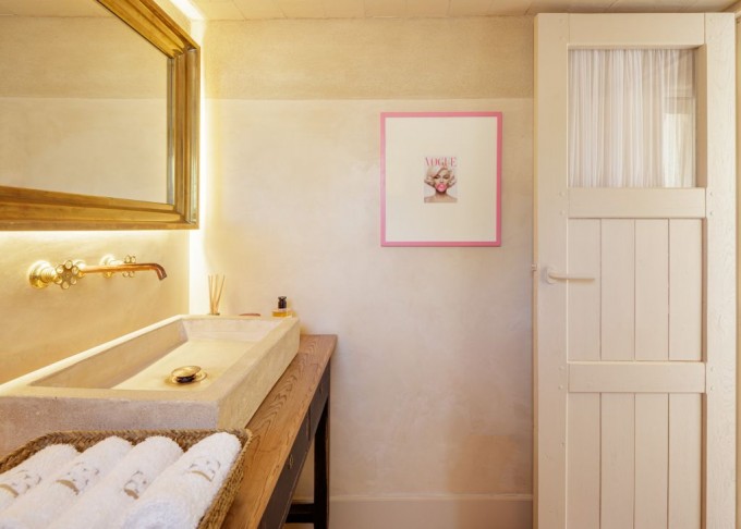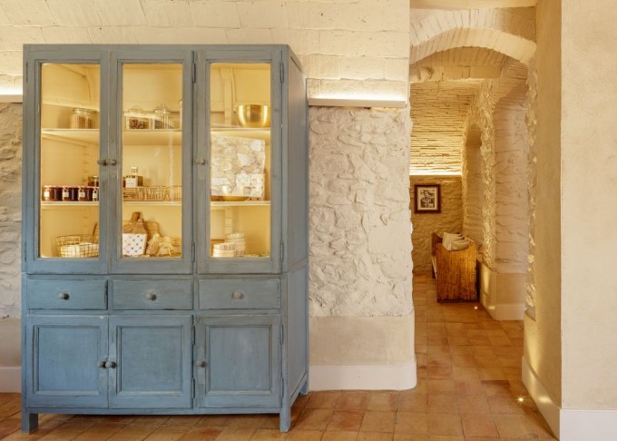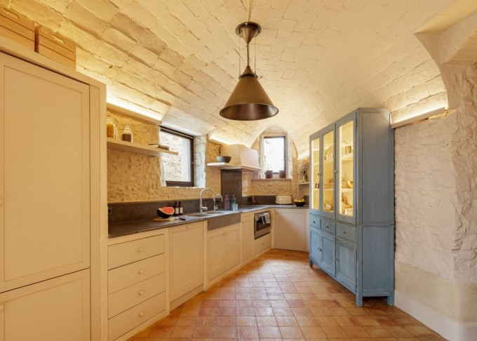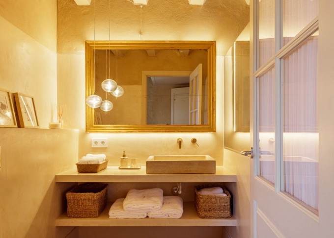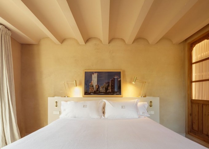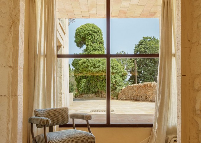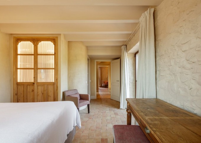 Elements provinents de recuperació, com són brancals i llindes de pedra, rajoles de ceràmica manual, portes, rentamans, aigüeres, tanques, fanalets, fonts i mobles apareixen en la intervenció reforçant la identitat de la masia, en un marc de colors ocres amb textures i materials rugosos.
