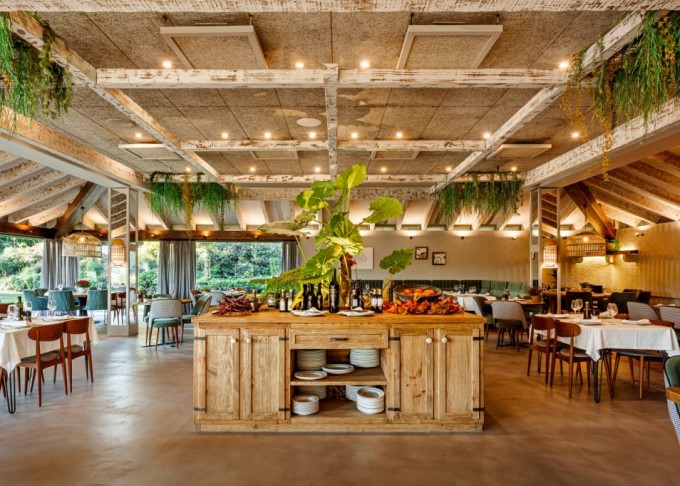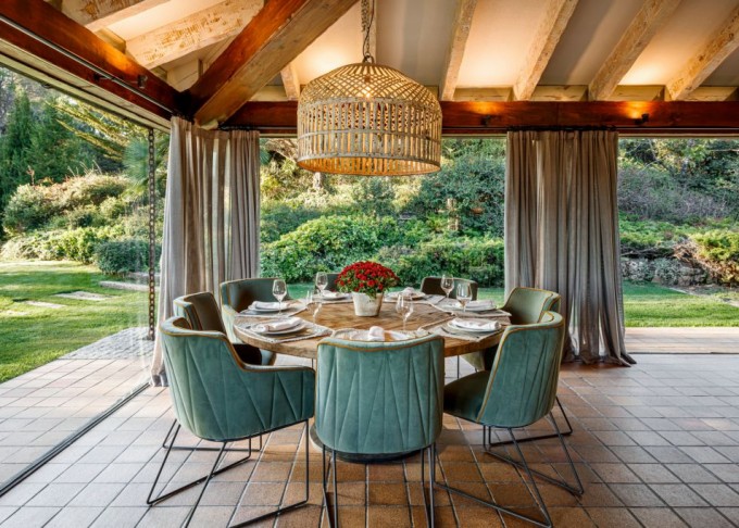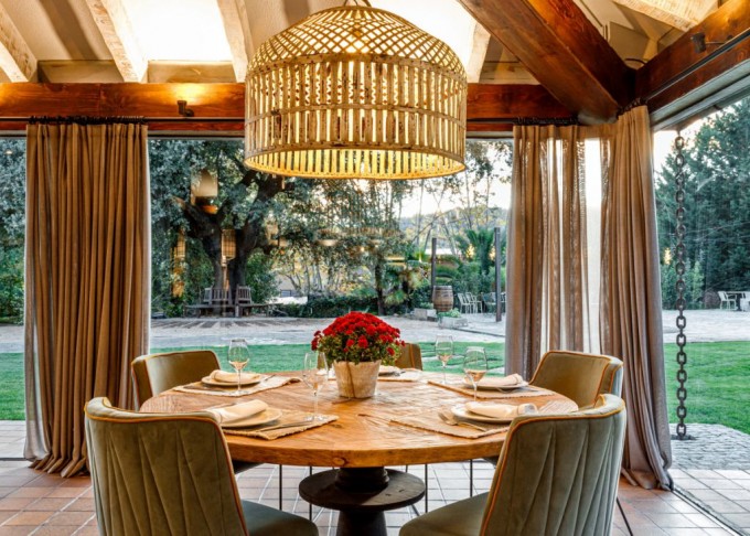 L'elecció de materials naturals, alguns fets a mà, com rajoles vidriades, fustes recuperades, llis, ratan o canya, juntament amb l'elegància de les bancades encoixinades, creen un ambient harmoniós i càlid.