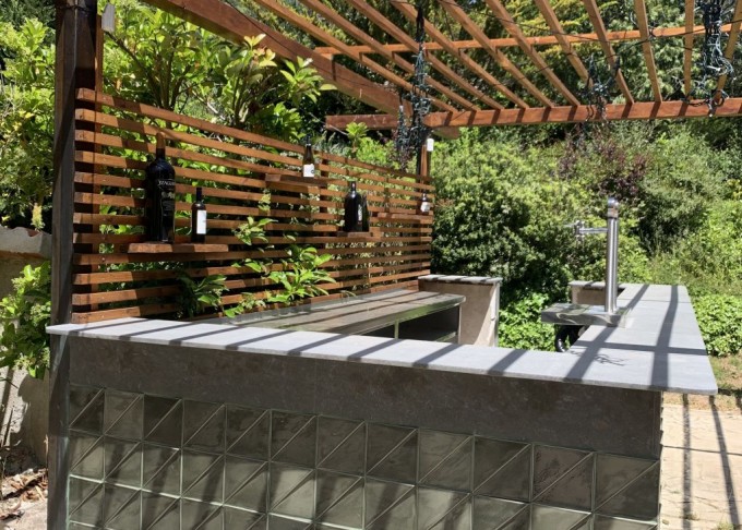 Project involving the construction of an outdoor cocktail bar in the garden of a restaurant, consisting of a bar and a structure that functions as a green roof canopy. A pergola arranged in an "L" shape thus takes into account the space designed for the bar, as well as the table area.