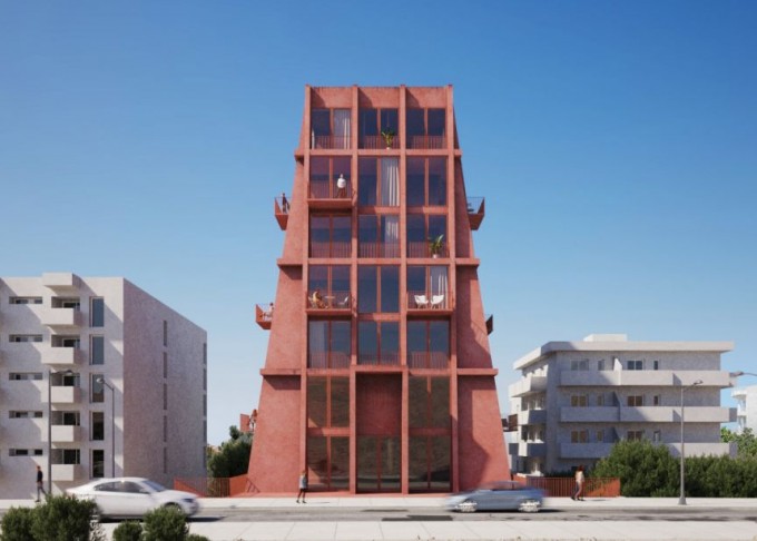 The inverted trapezoidal massing gives the building a distinct identity while improving solar exposure and creating a lighter visual footprint that integrates harmoniously into its context.