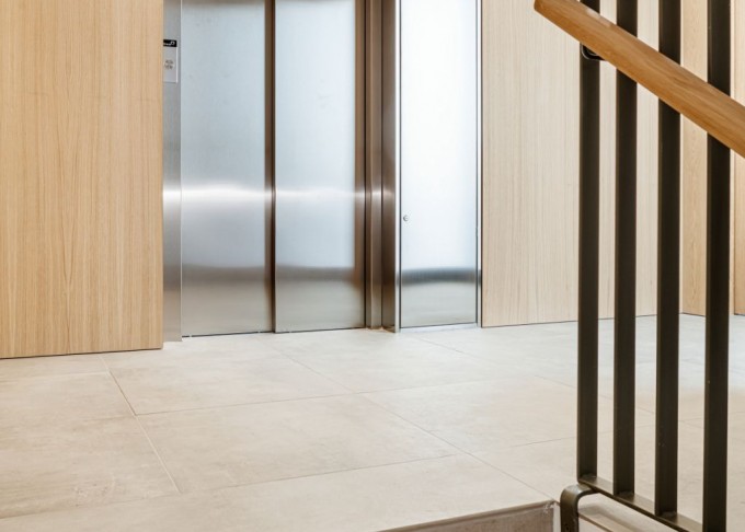 The façade design is based on a combination of openings of varying width – one, two or three modules. These openings are not always aligned. They have a vertical format with a slab to slab height and incorporate elements such as the window and door frames and shutter head boxes. The façade is faced with large porcelain tiles, combining two colours in different sizes and arrangements.