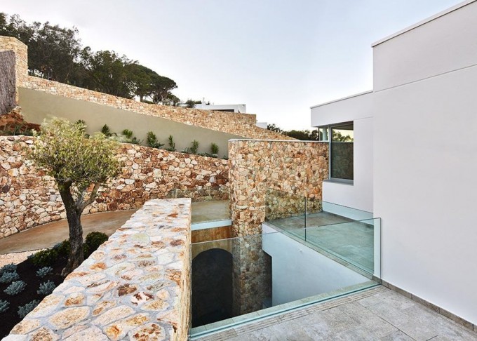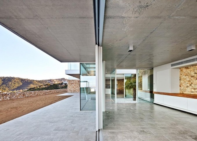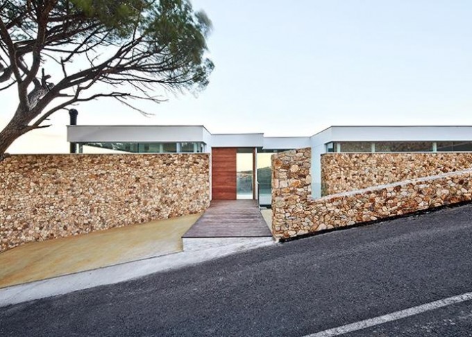 Extendida hacia las perspectivas lejanas, aunque resguardada en sus espaldas por el desmonte realizado sobre el terreno, dada su acusada pendiente, ésta es una casa construida entre las rocas y el horizonte.