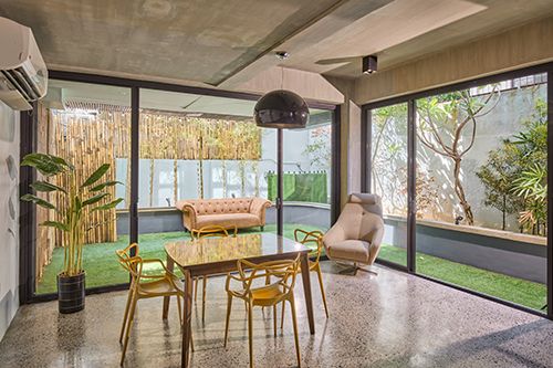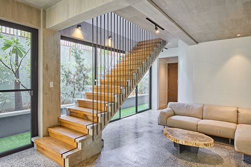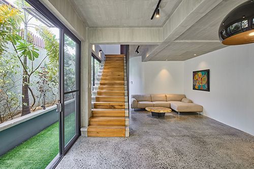 La relación con el patio y la vegetación se convierte en el hilo conductor del proyecto, de manera que se renuncia a construir las dos casas en todo el ancho de su fachada, sino que se reculan de ambos límites colindantes para generar un patio lateral ajardinado -y accesible desde el interior de las casas- de manera que la vivienda disfruta del verde en 360º.