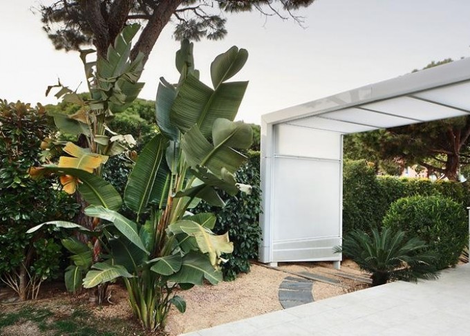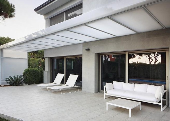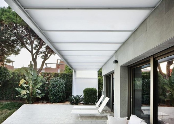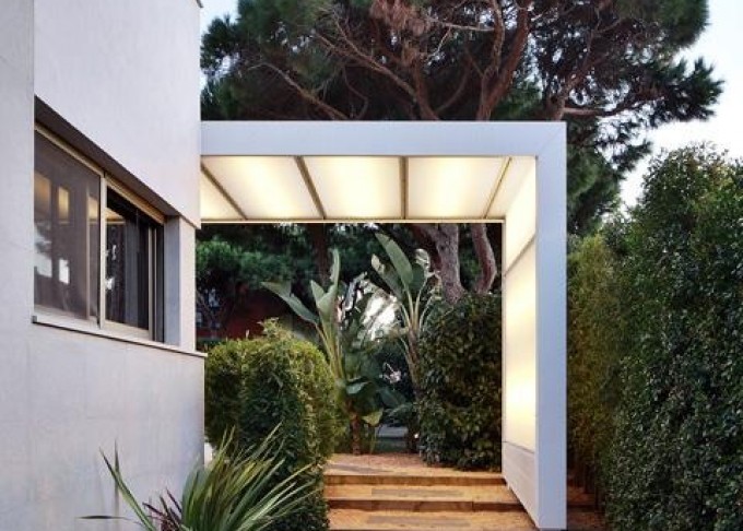 Construcción de una marquesina en una vivienda para protegerse del sol, extendiendo el salón-comedor vinculado al jardín exterior. Se ha construido neutra y discreta, para que en ningún momento compitiera con lo preexistente.