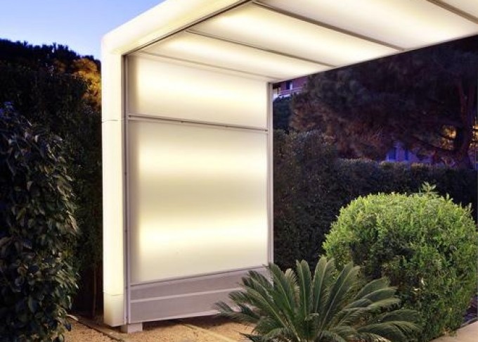 Se escoge el polimetacrilato translúcido por su imagen neutra y la ligereza visual que ofrece, así como por su función de filtro solar. De noche, se ilumina toda ella formando un portal iluminado.