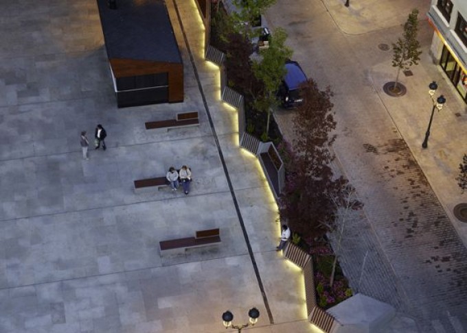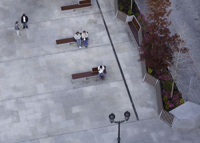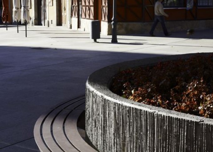 Se elimina el tráfico, concentrando las comunicaciones viarias y de servicio en una vertiente, liberando un espacio central amplio. Dos grandes jardineras lineales protegen la zona pacificada del bullicio de tráfico funcionando como filtros entre los dos. Unos elementos de mobiliario urbano que a la vez enfatizan el límite físico y visual de las propias plazas.